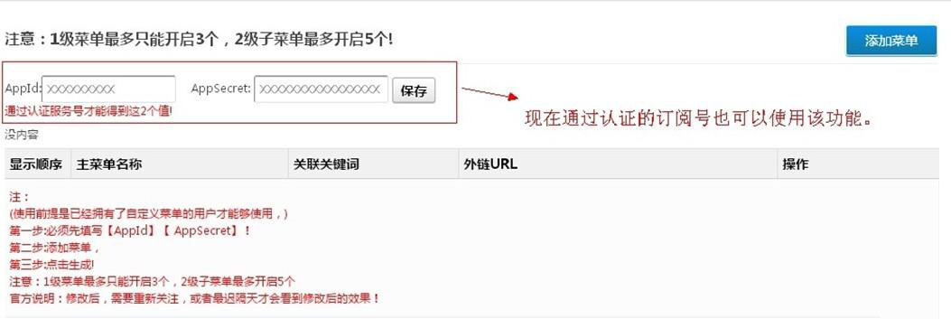 服務(wù)號(hào)、認(rèn)證的訂閱號(hào)都可以使用,如果在添加公眾號(hào)時(shí)沒(méi)有設(shè)置填寫AppID和AppSecret數(shù)據(jù)值,此時(shí)點(diǎn)擊【自定義菜單】會(huì)彈出: